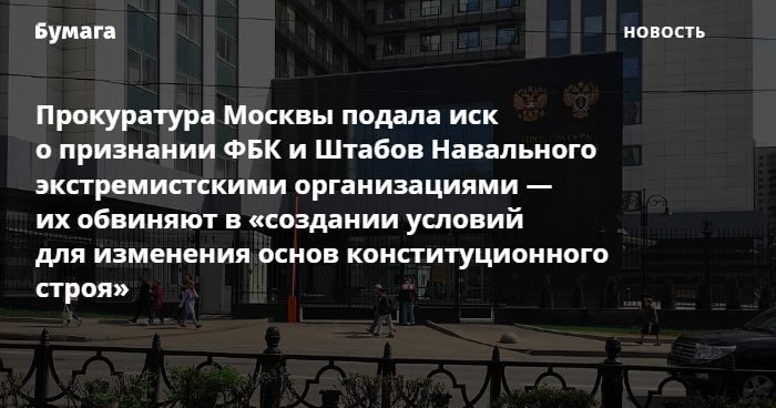 Прокуратура Москвы подала иск о признании экстремистскими организациями ФБК и штабов Навального, сообщает ведомство 16 апреля на своем сайте.