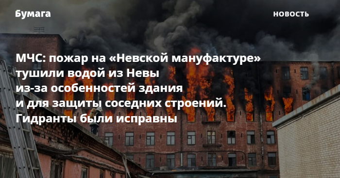 Очевидцы тушения пожара в здании «Невской мануфактуры» рассказывали, что у спасателей поначалу возникли сложности с забором воды — из-за того, что на территории не работали гидранты. В пресс-службе ГУ МЧС по Петербургу «Бумаге» 16 апреля опровергли эту информацию.