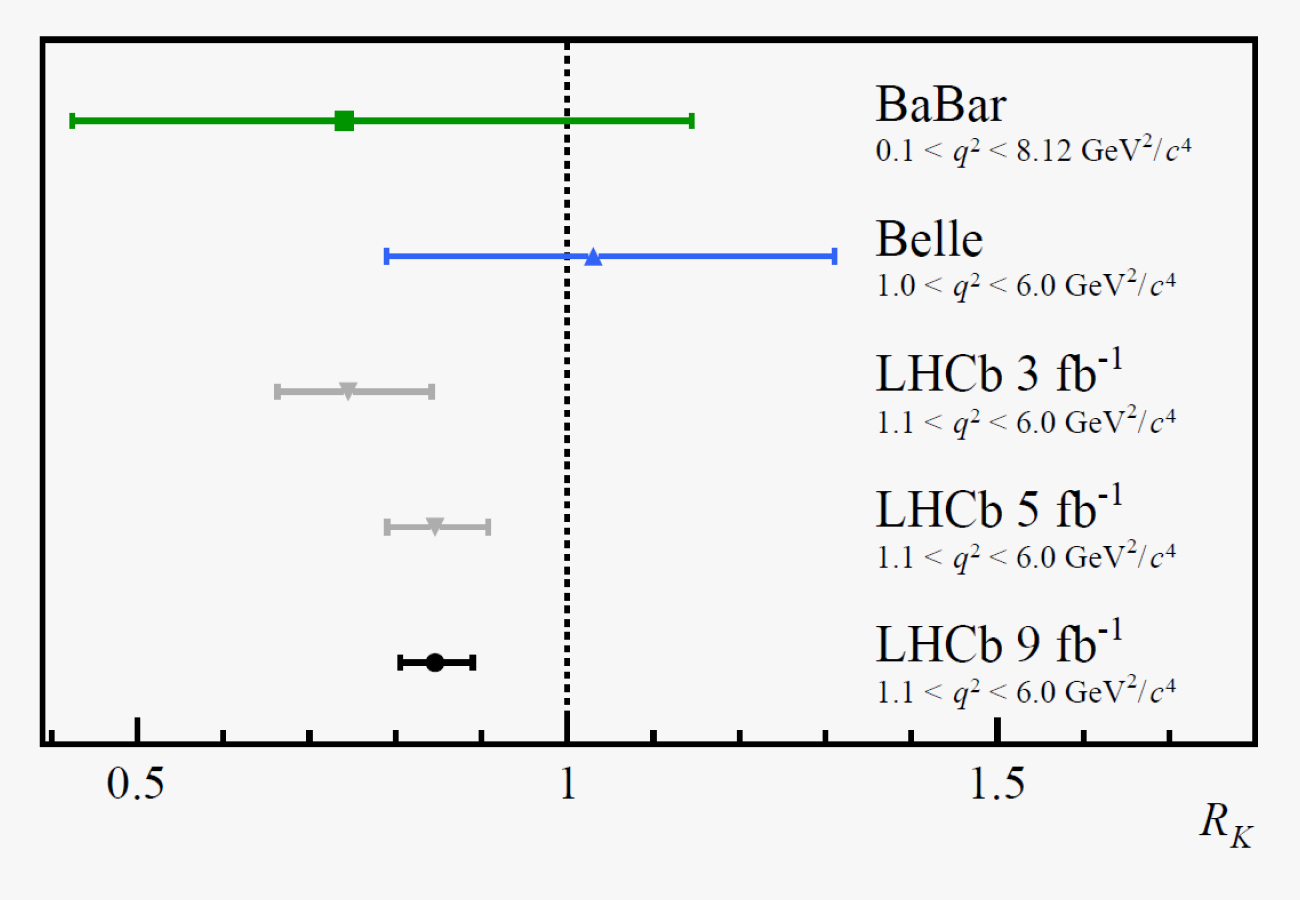 - Теоретический расчет вероятности распада B⁺ → K⁺μ⁺μ⁻ — дело очень сложное, ведь в процессе участвуют адроны, а их обсчитывать теоретики умеют лишь приблизительно. Но ровно те же погрешности относятся и в «сестринскому» распаду с участием электронов B⁺ → K⁺e⁺e⁻. Поэтому для отношения вероятностей этих двух распадов — оно обозначается RK — точность предсказаний получается очень высокой.