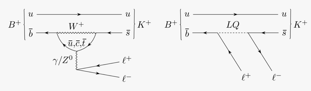 Герой мартовских новостей — распад B⁺-мезона на заряженный каон и лептонную пару μ⁺μ⁻ или e⁺e⁻. В ходе него b-кварк должен превратиться в s-кварк. Но в рамках Стандартной модели организовать такой распад очень непросто: в ней не существует частицы, способной напрямую превратить b-кварк в s. Этот процесс должен идти внутри мезона в несколько этапов и требует «помощи» тяжелых виртуальных частиц: они на мгновение возникают внутри мезона, организуют кварковые превращения, а потом снова исчезают.