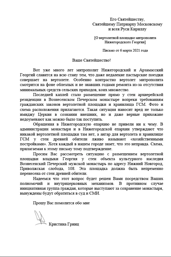 Группа православных активистов из Нижнего Новгорода обратилась к патриарху и местным властям с жалобой на размещение вертолетной площадки в историческом центре города. Заявители настроены решительно: по их мнению, площадка у стен Печерского Вознесенского монастыря, обслуживающая единственного клиента — управляющего Нижегородской епархией РПЦ митрополита Георгия (Данилова), — наносит урон памятнику XVI века и природному ландшафту вокруг него.