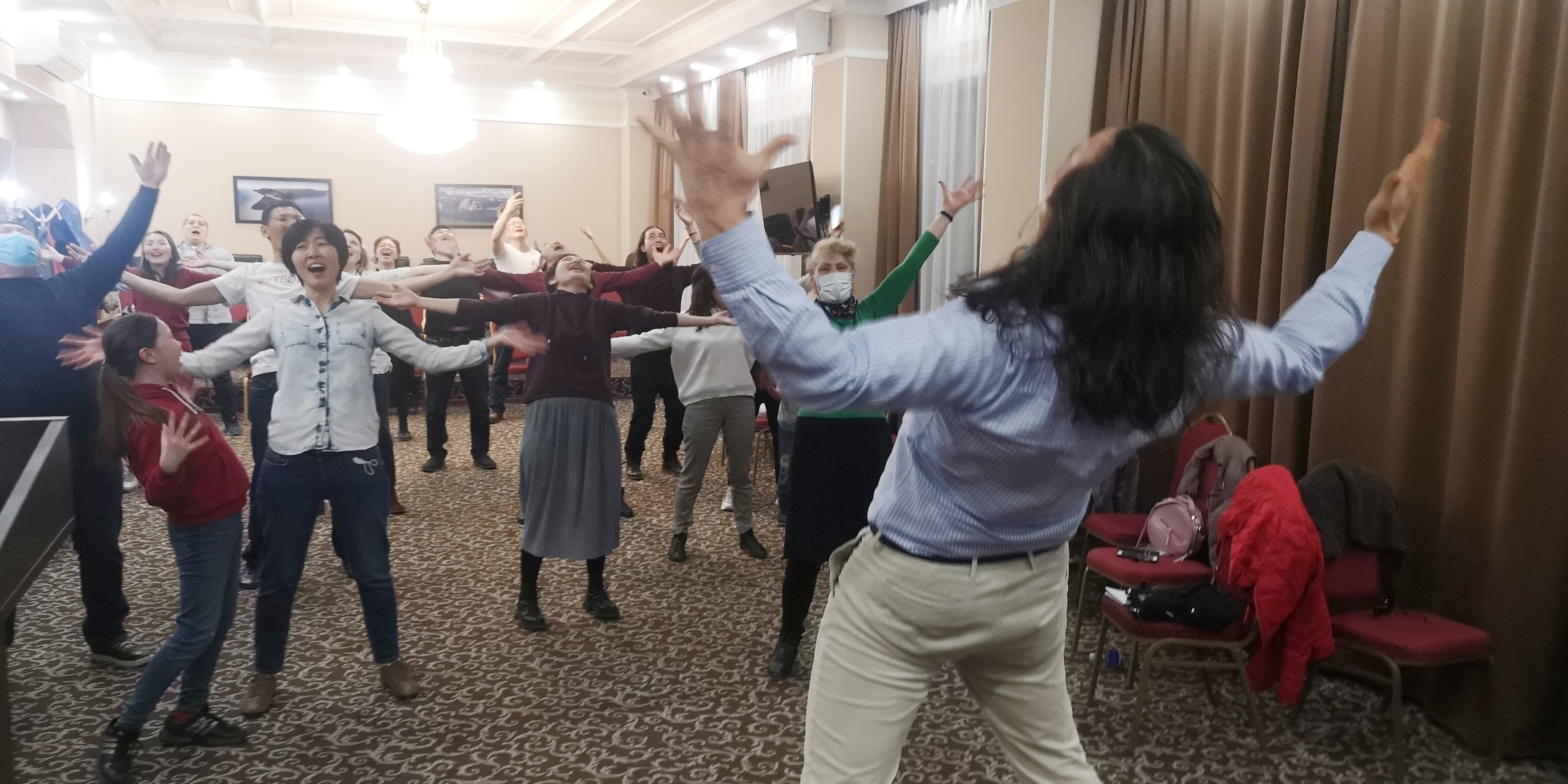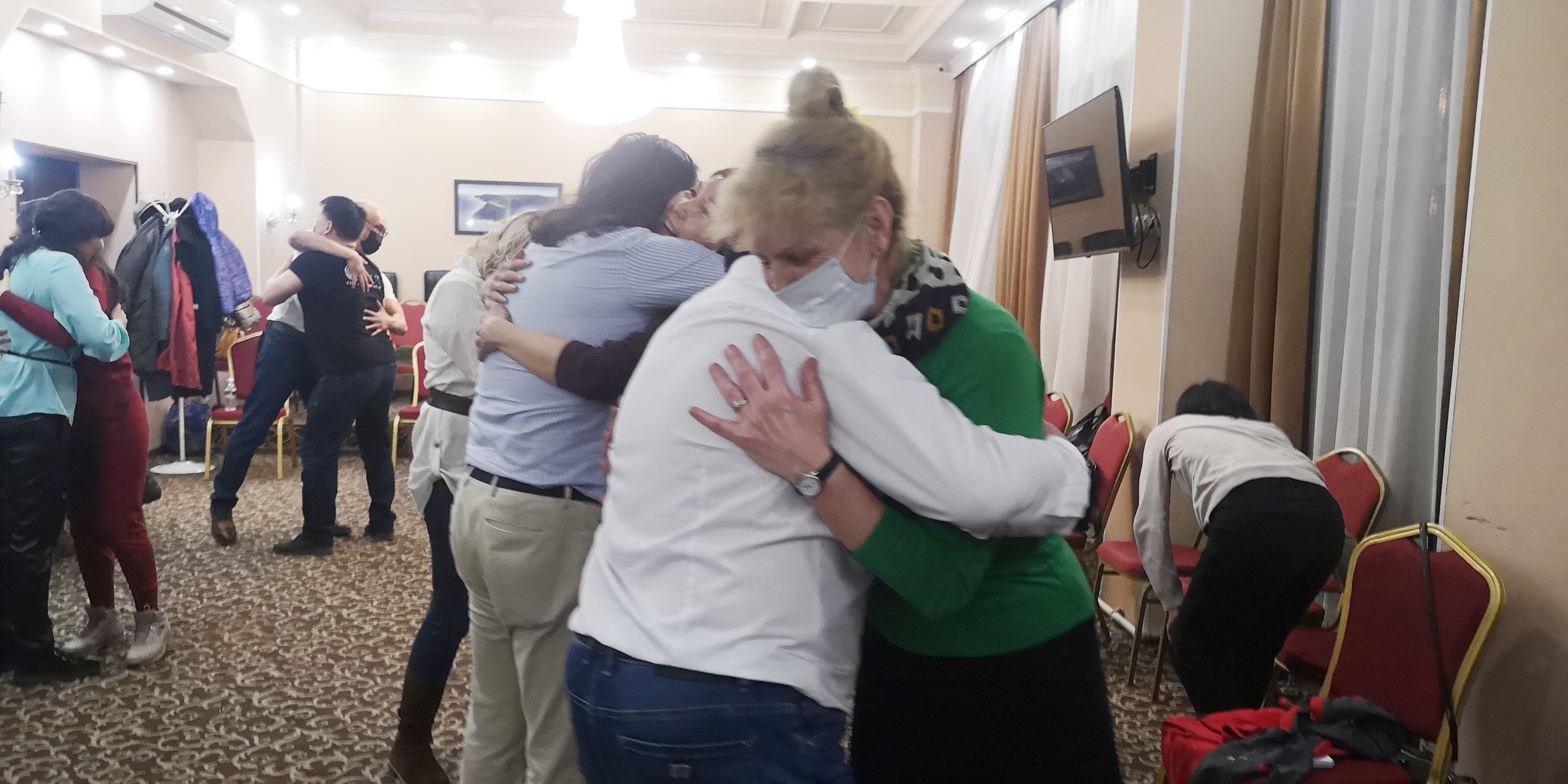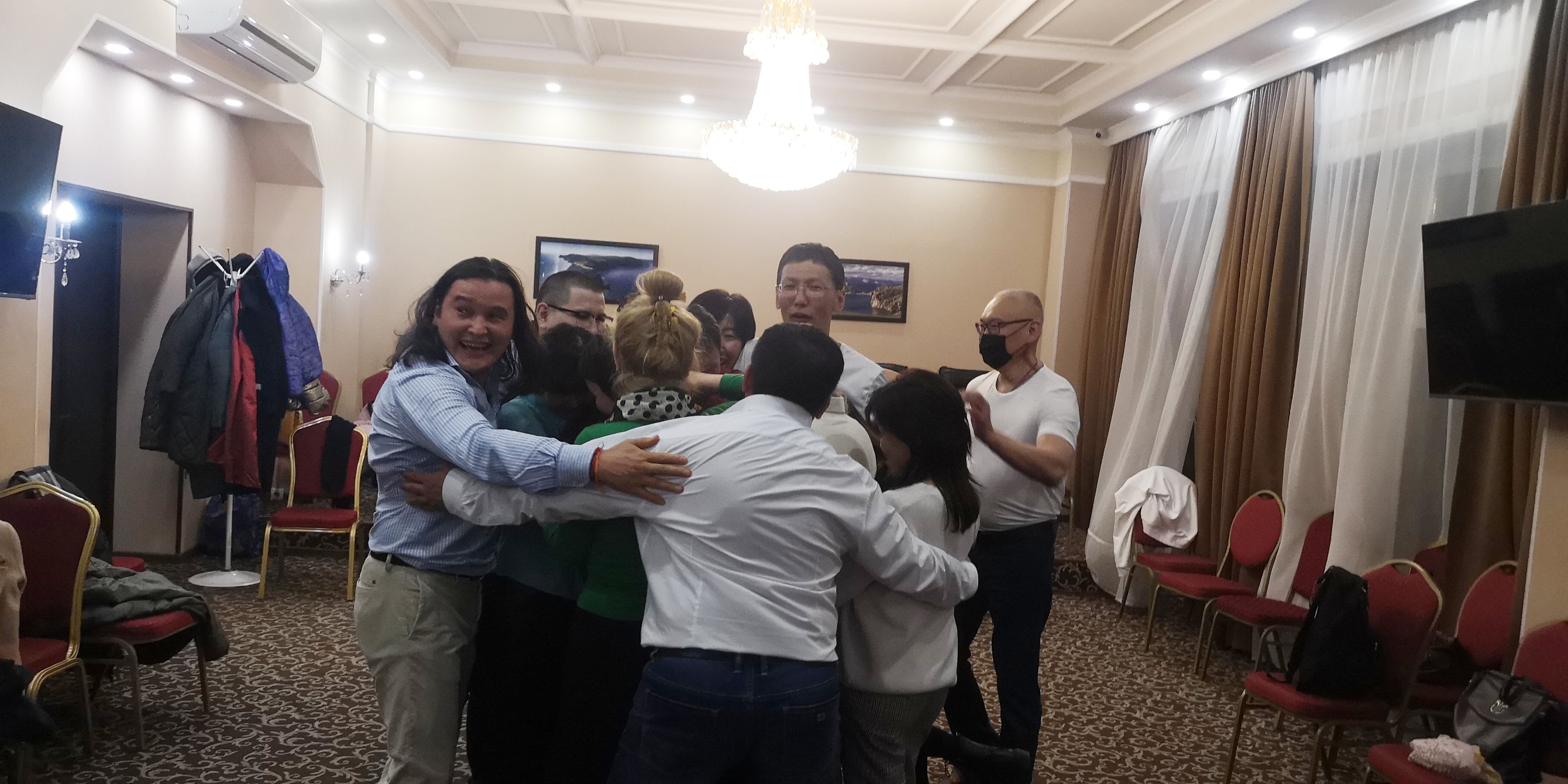 Затем Дмитрий показал еще одно полезное упражнение: "Обнимашки". И вот незнакомые люди начали обниматься, хлопать друг друга по спине и смеяться, глядя один другому в глаза.