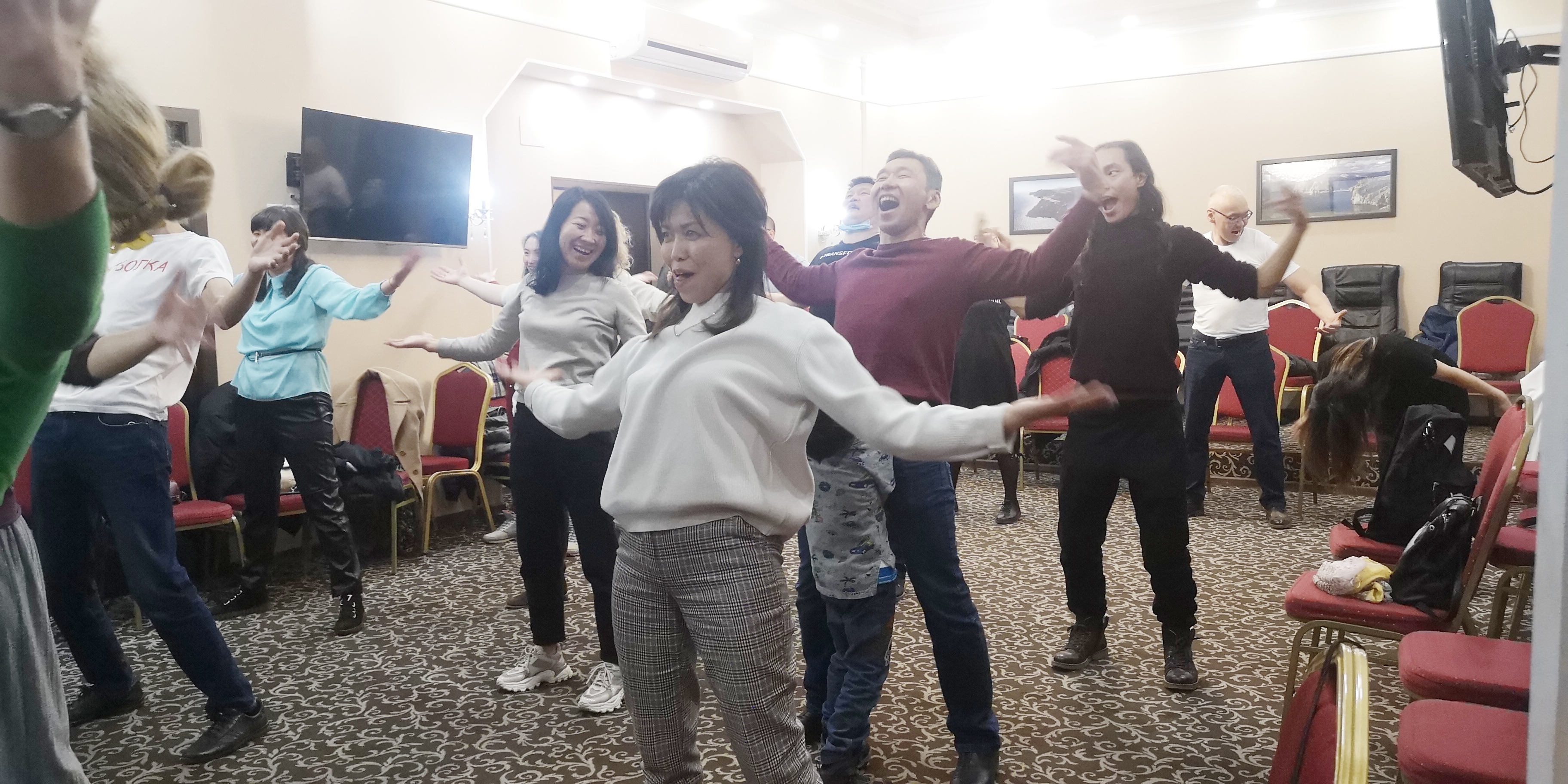 Сначала Дмитрий научил участников технике "правильного" дыхания. А потом – как начать смеяться, даже если тебе вовсе этого не хочется. Как выяснилось, хохотать в голос можно и когда ничего смешного вокруг тебя не происходит. Уже приблизительно через 15 минут все присутствующие убедились в этом на собственном опыте, овладев этим методом. Дальнейшие два часа мероприятие действительно напоминало утренник в детском саду. Убрав стулья, участники повторяли за ведущим тренинга телодвижения: кричали, прыгали, обнимались, хлопали в ладоши, играли.