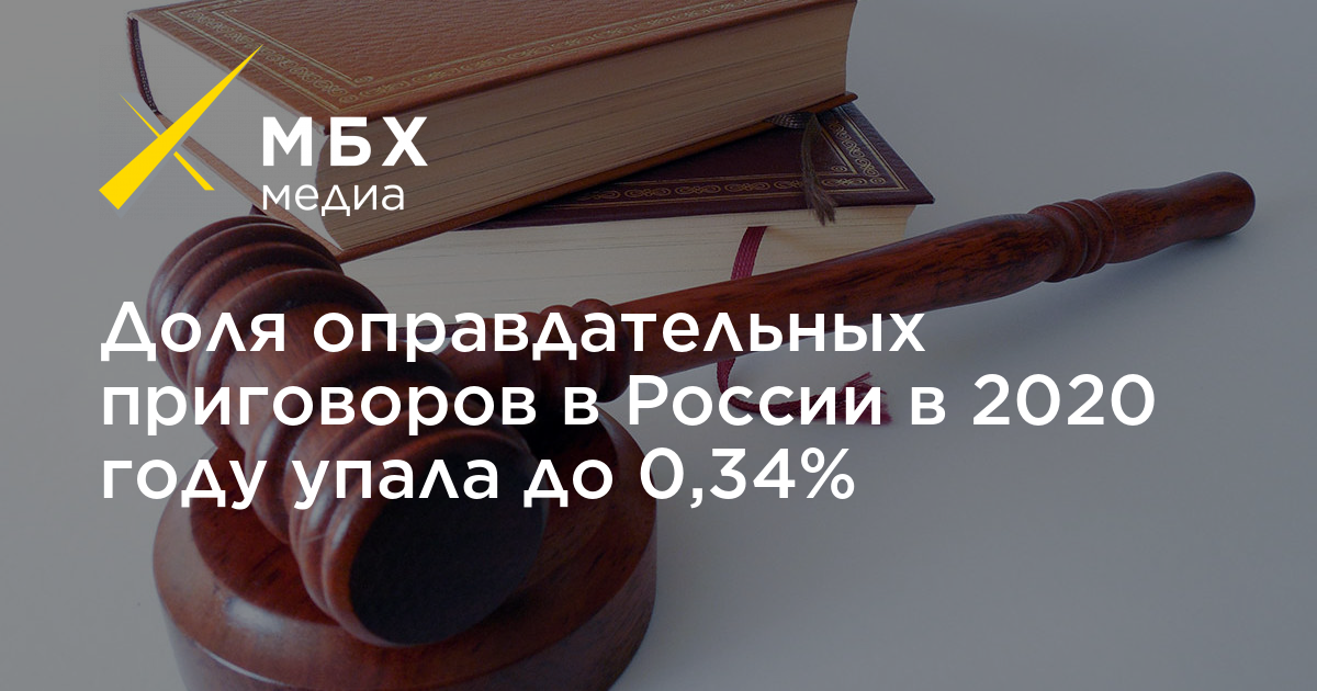 Доля оправдательных приговоров в российских судах в 2020 году снизилась до 0,34%, подсчитало «МБХ медиа» на основе данных Судебного департамента при Верховном суде. Всего за год суды вынесли 562 906 обвинительных приговоров против 1931 оправдательного.