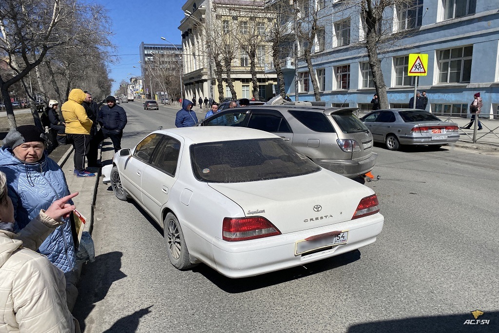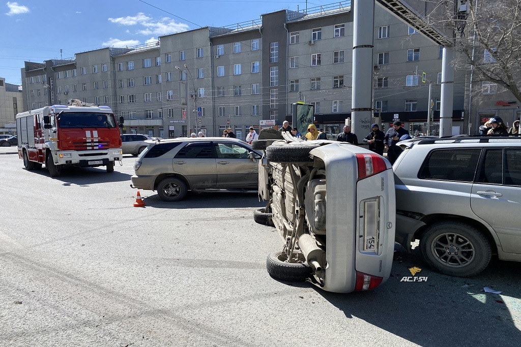 Toyota Camry и Cresta, кроссоверы Toyota Harrier и Highlander столкнулись на пересечении улиц Красный Проспект и Ядринцевская. Из-за ДТП на бок завалился седан Mazda Familia, сообщил паблик «АСТ-54».