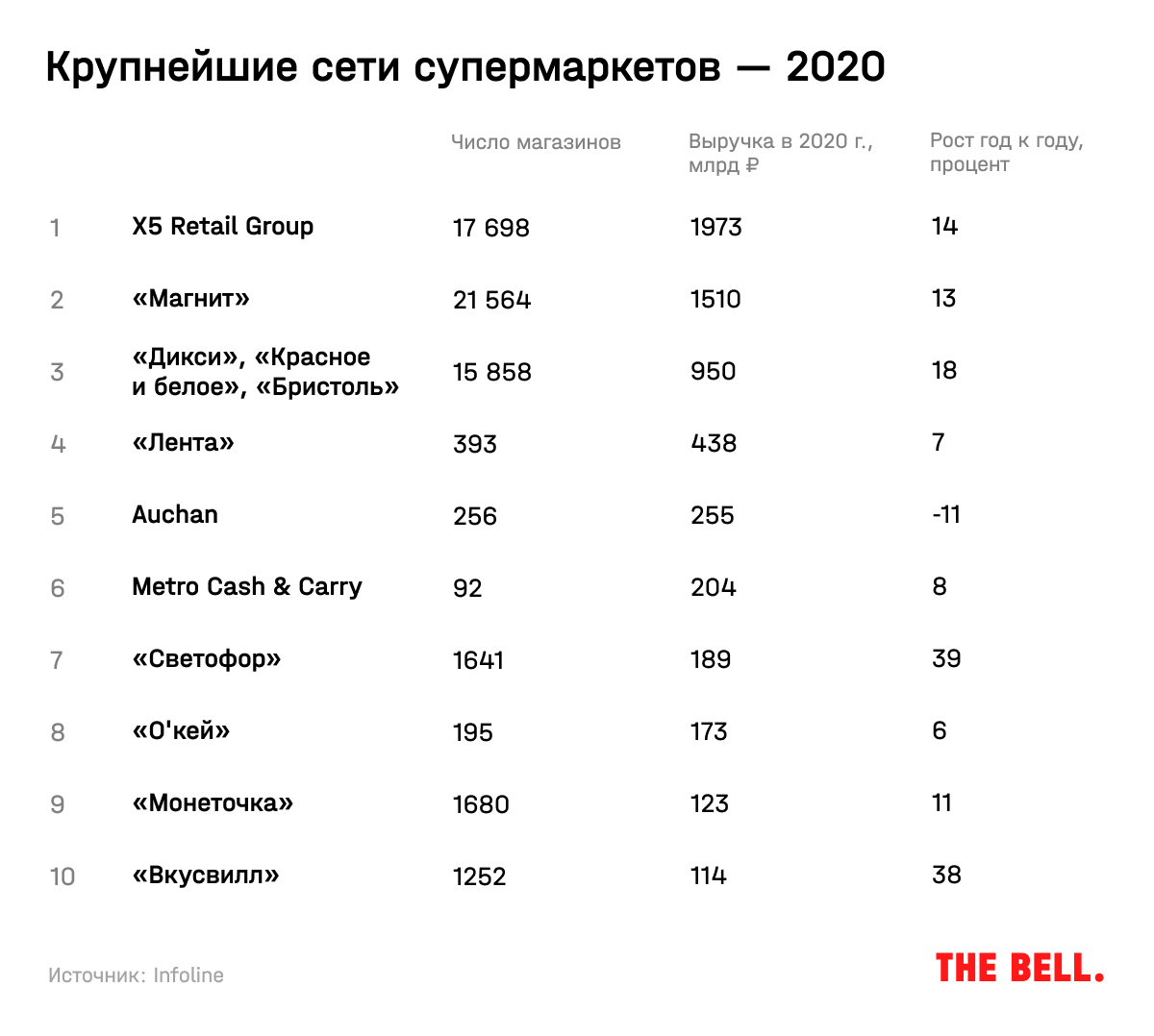 В 2020 году продажи сети «Светофор» прибавили почти 39%, подсчитала компания Infoline. Сравнимо — на 38% за год — вырос только «Вкусвилл». Но его выручка заметно меньше: 114 млрд против почти 189 млрд рублей у «Светофора». Metro Cash & Carry (204 млрд рублей) и Auchan (255 млрд), расположившиеся выше «Светофора» в списке крупнейших сетей, не выглядят недосягаемыми. Особенно если учесть, что у Metro продажи за год выросли всего на 8%, а у Auchan даже упали — на 11%.