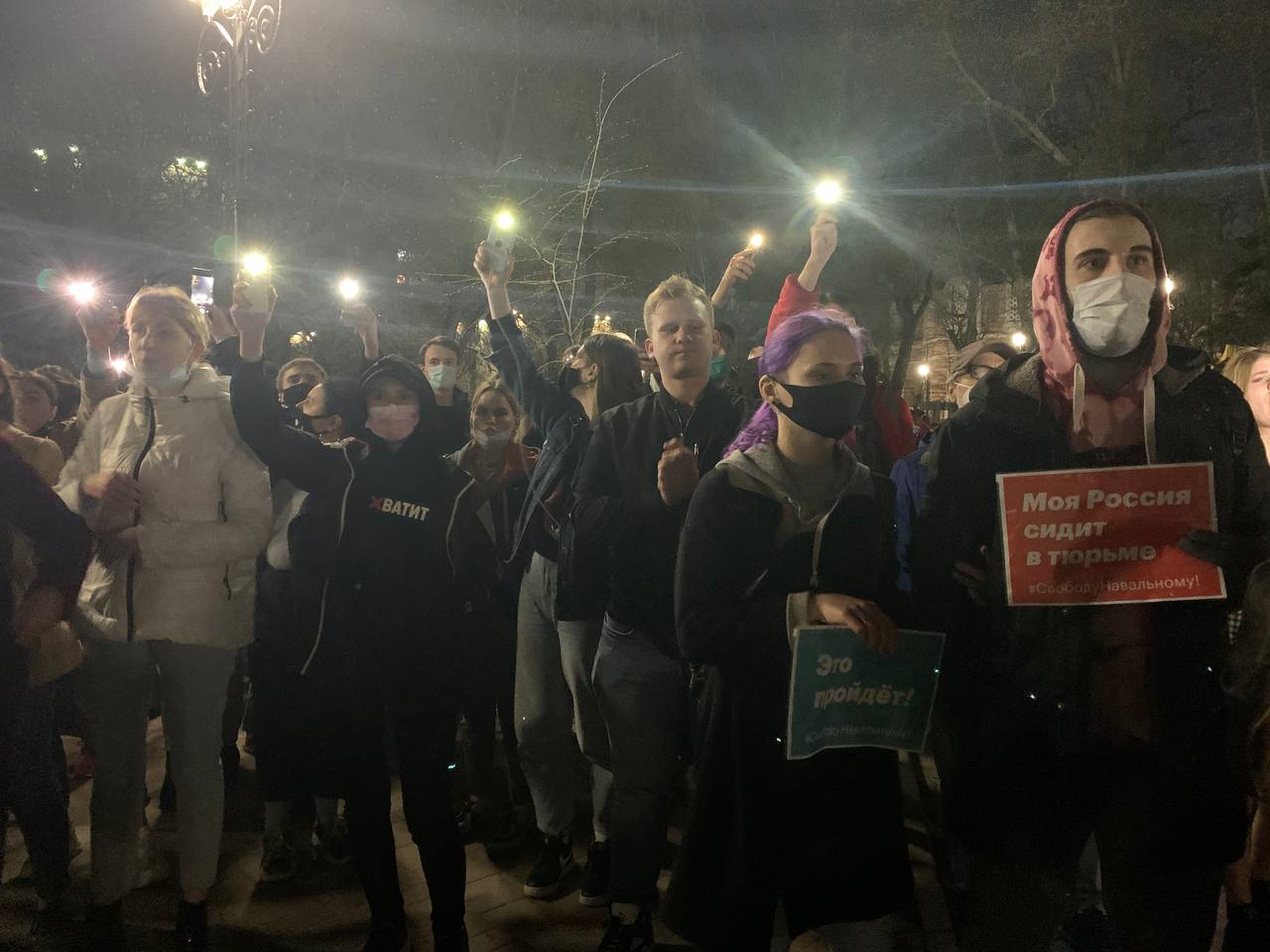 На митинг вечером 21 апреля вышли сотни, скандируя: "Мы не рабы!", "Долой царя!" и "Полиция должна быть с народом". Они требуют, чтобы их пропустили через ограждения на проспекте Котовский и дали пройти в сторону Ворошиловского проспекта. Силовики же планируют выпускать их группами по пять-десять человек, передает корреспондент Кавказ.Реалии с места событий.