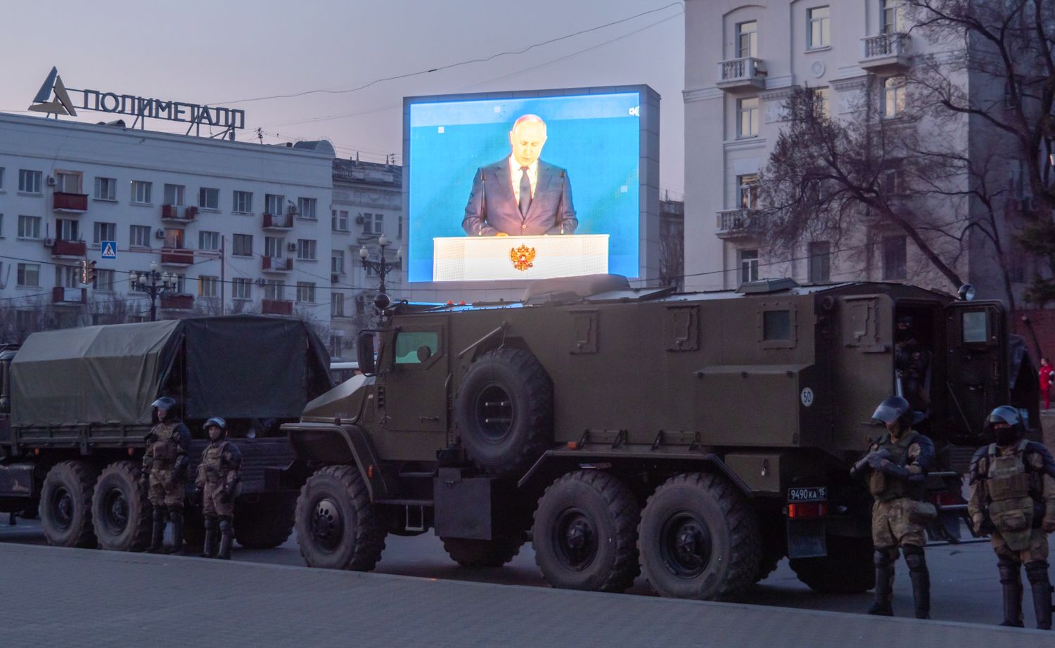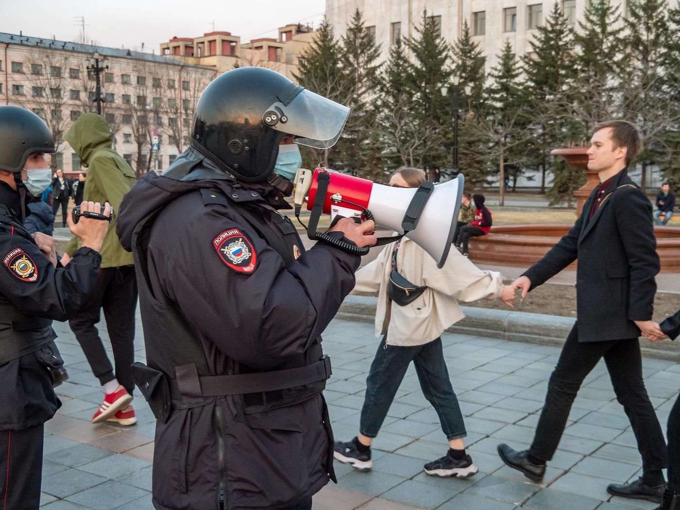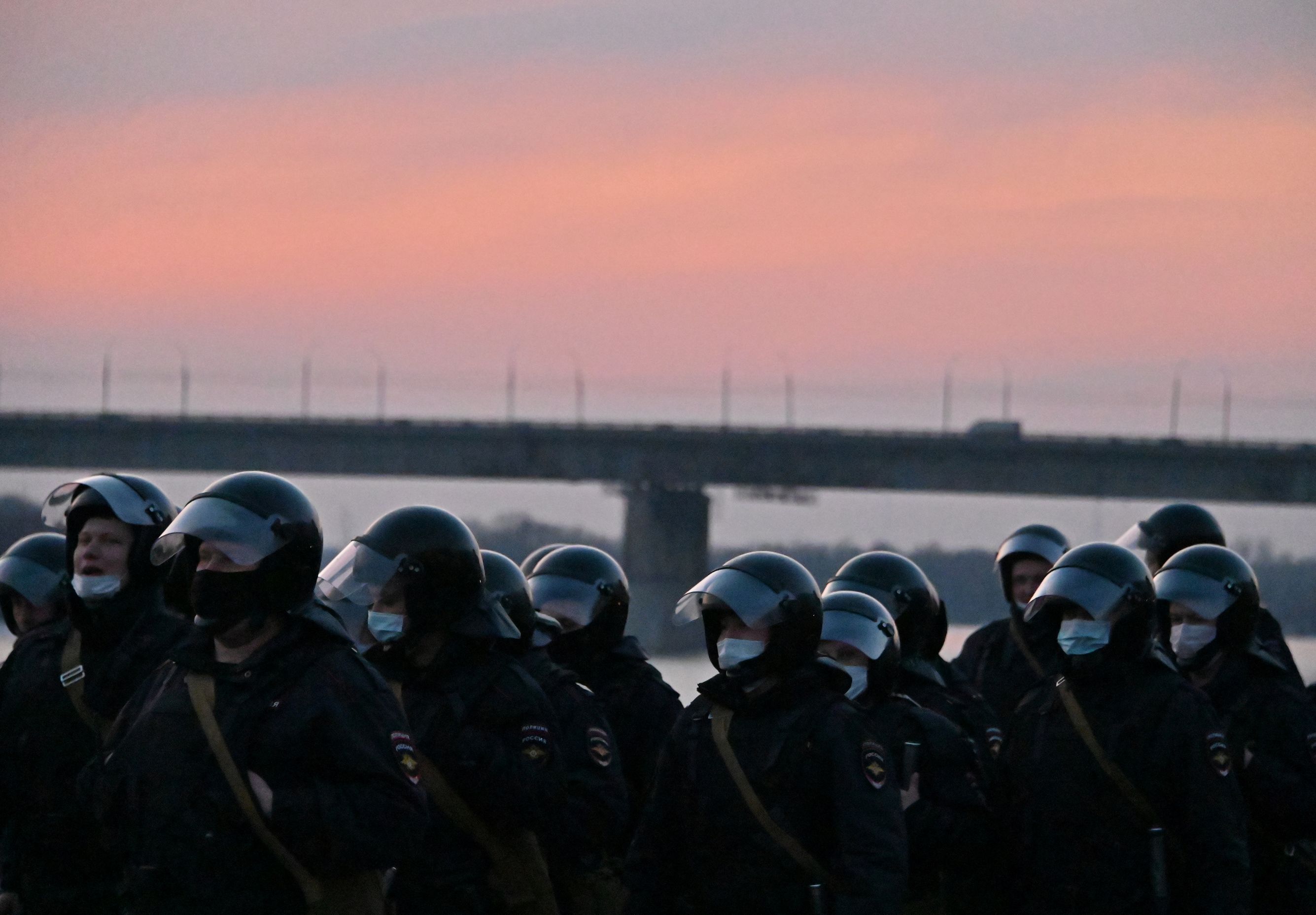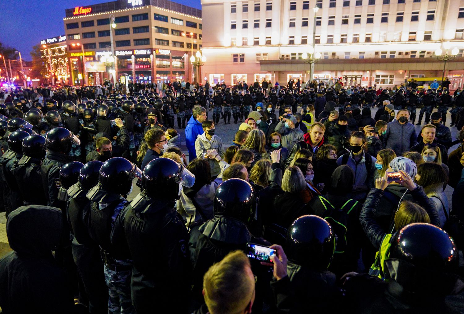 Игорь Волков / Коммерсантъ Протестующие водят хоровод на площади Ленина, а сотрудник полиции с мегафоном требует, чтобы они покинули место проведения акции протеста. Игорь Волков / AP / Scanpix / LETA Полиция готовится к акции протеста, пока на больших экранах транслируют обращение Владимира Путина.