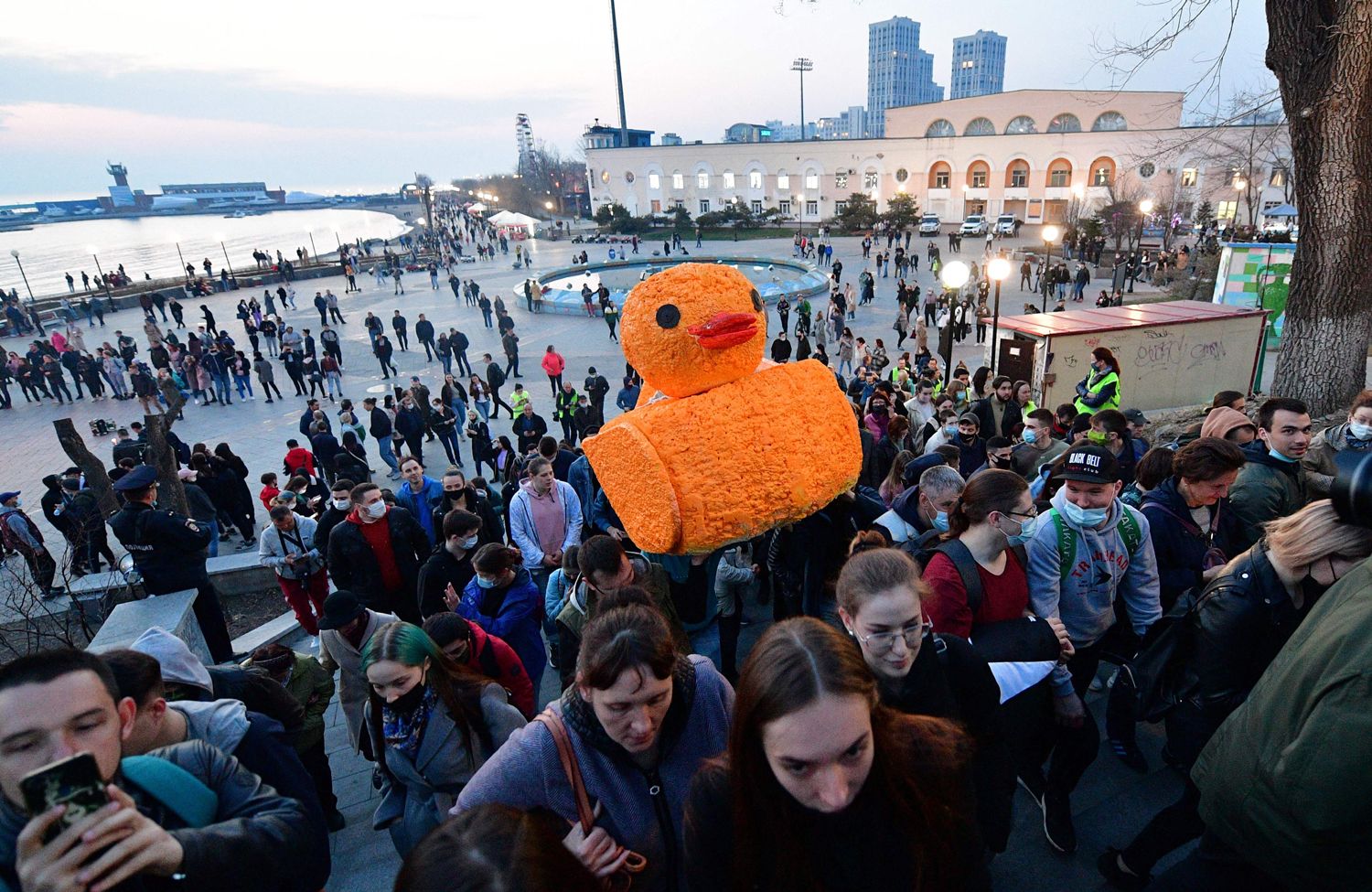 Павел Королев / AFP / Scanpix / LETA Протестующие с оранжевой уточкой, напоминающей о первом большом фильме команды Навального «Он вам не Димон», после выхода которого случились масштабные митинги. Юрий Мальцев / Reuters / Scanpix / LETA Место проведения акции во Владивостоке в последний момент изменили на Привокзальную площадь. Протестующие стоят за памятником Ленину.Юрий Смитюк / ТАСС / Scanpix / LETA В общей сложности на улицы Владивостока вышли до 500 человек
