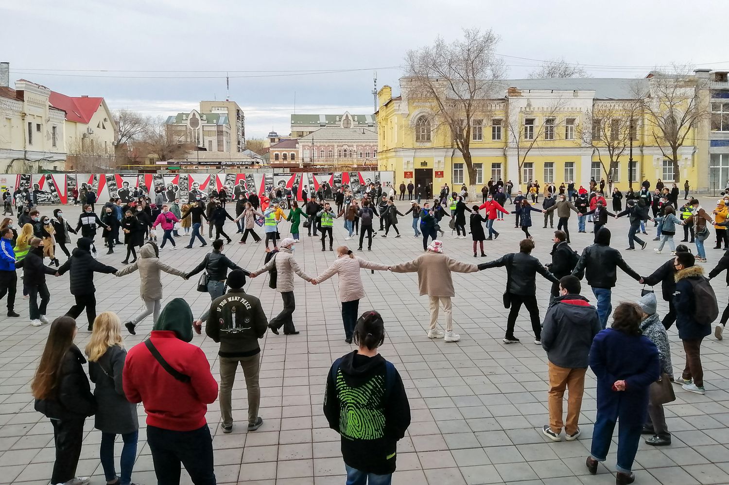 Алена Гниденко / ТАСС Участники акции в Оренбурге водят хоровод. На улицы города, по оценкам местных СМИ, вышли около 200 человек.
