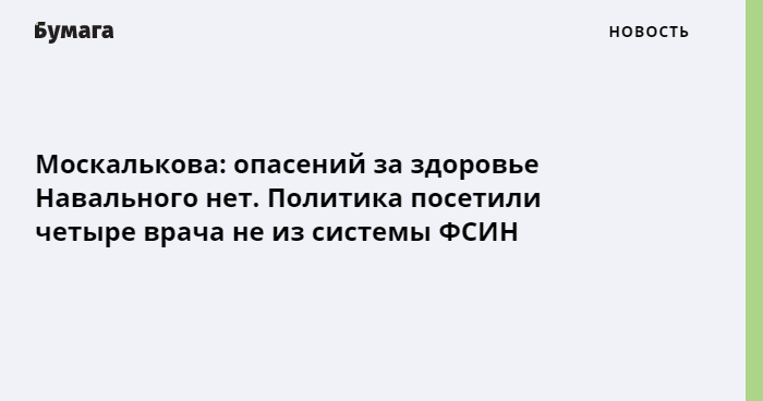Уполномоченная по правам человека в России Татьяна Москалькова заявила, что оппозиционера Алексея Навального, который требует допустить к нему независимого врача, посетили четыре медика не из системы ФСИН, сообщает «РИА Новости». По ее словам, серьезных опасений за здоровье политика нет.
