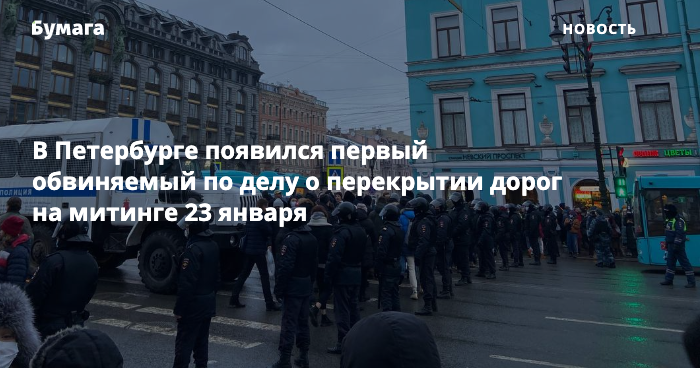 В Петербурге появился первый обвиняемый в рамках дела о перекрытии дорог на митинге 23 января. Об этом сообщает «ОВД-Инфо» со ссылкой на самого обвиняемого.