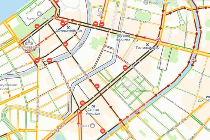 К 20:30 в Петербурге частично перекрыты дороги в центре, свидетельствуют данные «Яндекс.Карт». На перекрытый Невский жалуются в соцсетях.