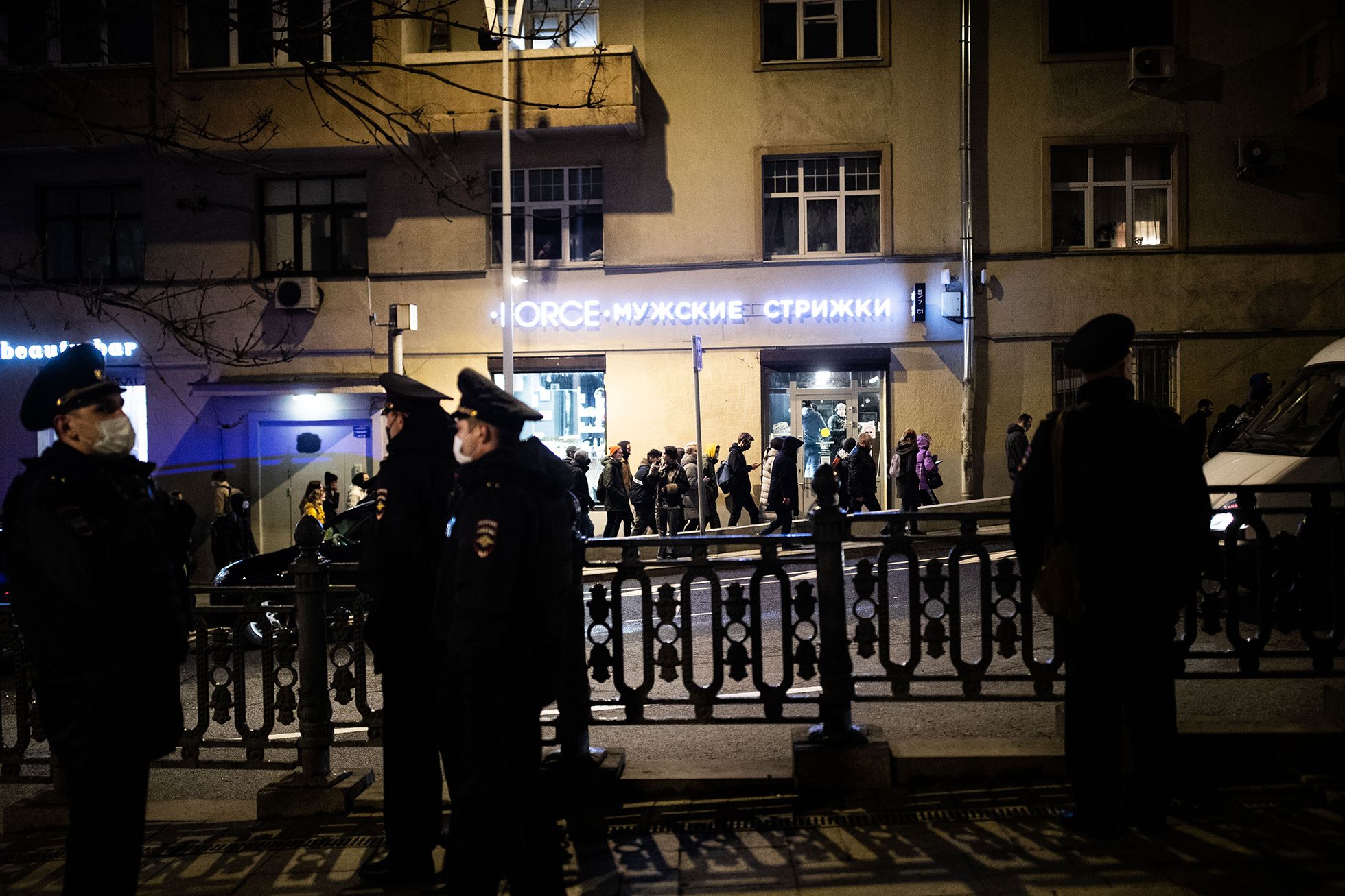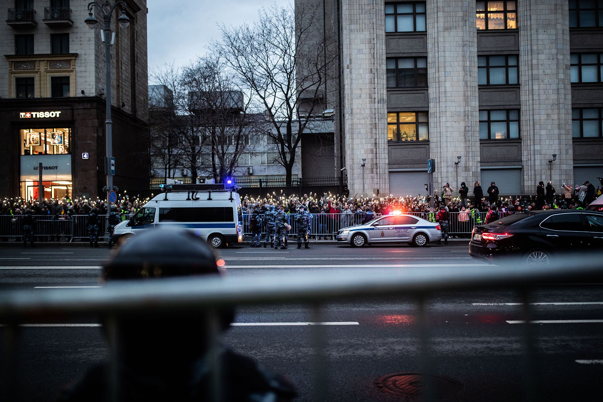 Moscow’s protest in support of jailed opposition politician Alexey Navalny was supposed to take place near the Kremlin, on Manezhnaya Square. But on the morning of April 21, the security forces cut off access to the area. Shortly before the start of the rally, the organizers suggested that the protesters move in two columns coming from Pushkin Square and the Arbat. The two groups met at the top of Tverskaya Street; they were never allowed onto Manezhnaya Square. The Moscow rally was unusually peaceful; at the time of this writing the arrest count was only around 30 people (for comparison, St. Petersburg saw more than 800 detentions). According to police officials, 4,500 protesters took to the streets in the Russian capital (though the protest organizers have suggested multiplying this figure “by ten”). Photographer Evgeny Feldman was on the ground in downtown Moscow capturing the day’s events — here’s what he saw.