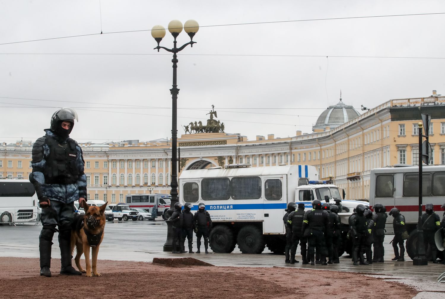 Пока полиция обыскивала активистов и журналистов, на Дворцовой площади, которую накануне окружили металлическими ограждениями, состоялась репетиция военного парада — с оркестром — ко Дню Победы. Позже к площади стянули уборочную технику, ею в Петербурге традиционно перекрывают улицы во время протестов. Все входы на Дворцовую, куда изначально собирались прийти соратники Навального, оказались перекрыты. Журналистам полиция говорила, что пройти за ограждения могут «только жильцы».