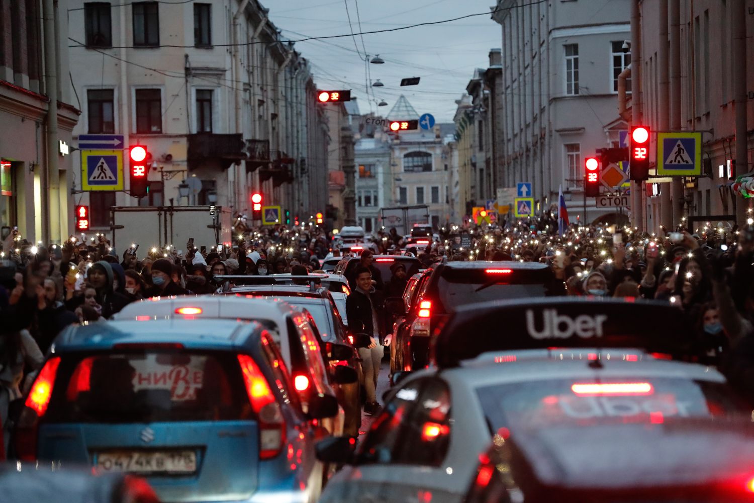 Протестующие тем временем покинули Сенатскую площадь и двинулись к Сенной площади. В какой-то момент людей стало так много, что они полностью заняли переулок Гривцова, ведущий к площади. Протестующие скандировали «Путин — вор!» и «Навальному — врача!» (новая кричалка, использовавшаяся и в Москве). Затем они подняли телефоны с включенными фонариками — происходящее напоминало концерт под открытым небом, а не акцию протеста.