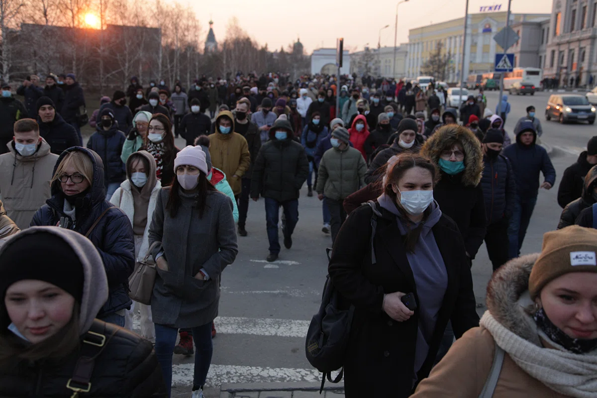 К 17.40 на площади выставили заграждения. А за полчаса до начала акции штаб Навального ответил чиновникам: изменил стартовую точку, позвав людей к резиденции губернатора. Всего за время шествия, которое координировали с помощью telegram-канала штаба, было изменено семь точек маршрута. Он прошел вдоль и поперек всего центра города.