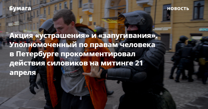 Уполномоченный по правам человека в Петербурге Александр Шишлов прокомментировал действия сотрудников правоохранительных органов на митинге 21 апреля. Он назвал их «акцией запугивания» и «акцией устрашения» в эфире телеканала «Дождь».