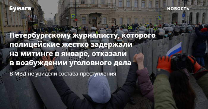 Петербургскому журналисту, которого полицейские жестко задержали на митинге в январе, отказали в возбуждении уголовного дела