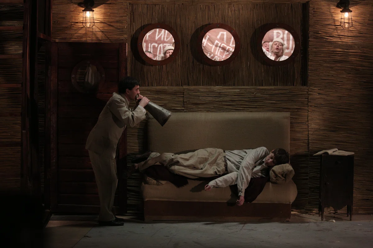 — У нас в кадре диалог дословный. И возмущение актера: «Я не саксаул! Я не могу находиться в таком состоянии!» Или когда наш герой — писатель Семен Курочкин — в истерике заливается хохотом, увидев мертвую маму с монетами на глазах. «Она в очках!» Это история Эйзенштейна. Но когда человек вспоминает, даже самый честный невольно что-то скрывает о себе. В дневниках он — другой. Хотелось посмотреть на героя объемно. Увидеть его не только таким светлым, как в книге. Увидеть глазами близких. Сцена, где жена дарит ему абрикосовое варенье, а он ведет себя деспотично — из воспоминаний жены Зощенко. Вот и возникает вдруг несколько утрированный критический взгляд снаружи.