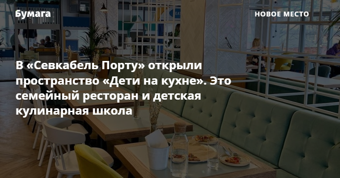 В апреле на территории «Севкабель Порта» заработало гастрономическое пространство «Дети на кухне», сообщили «Бумаге» представители проекта. Его общая площадь составляет 540 квадратных метров, пространство включает в себя семейный ресторан и детскую кулинарную школу.