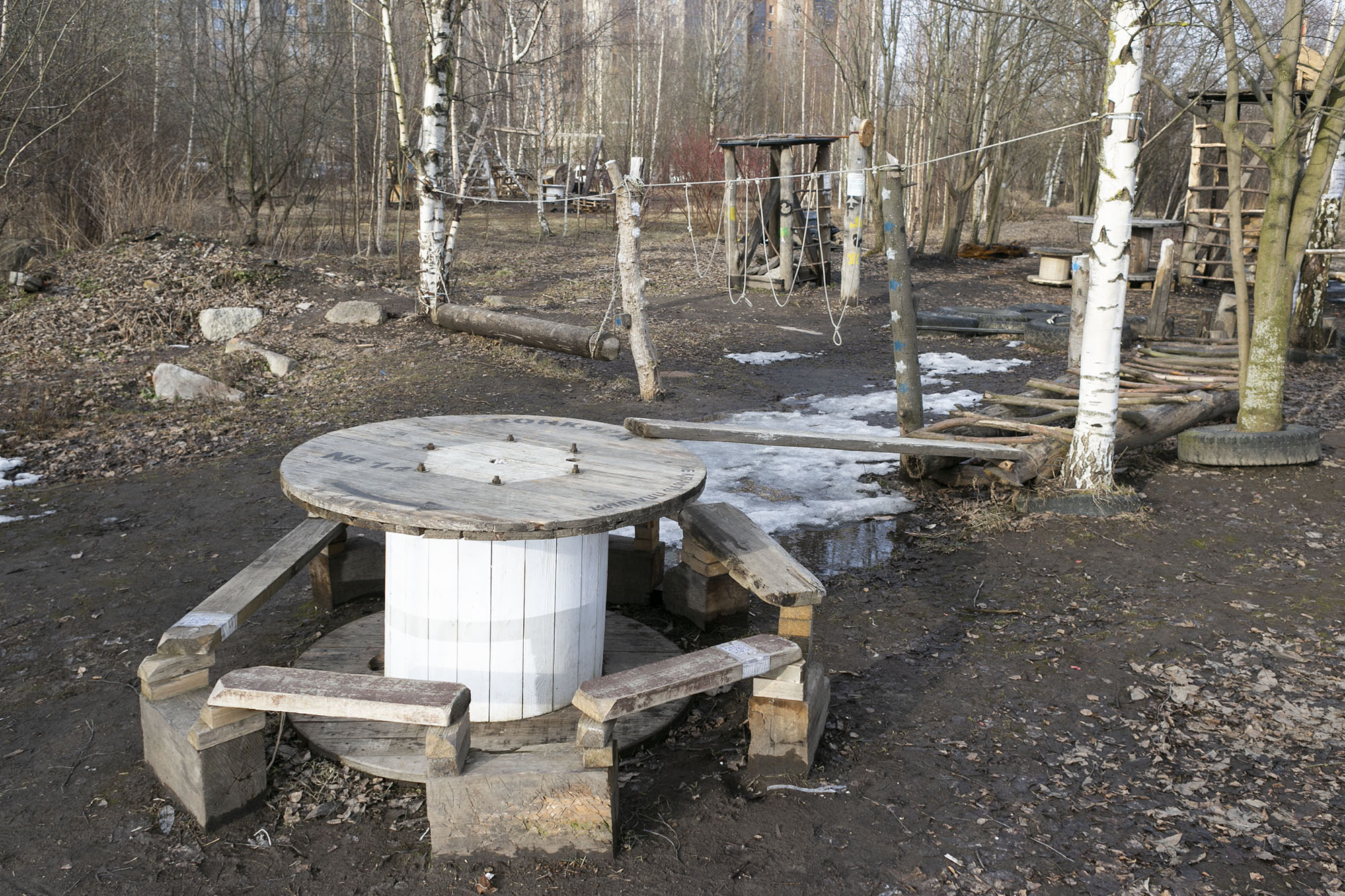Мы решили сделать веревочный парк. Но когда начали, поняли, что материалов уже не хватает. Поехали искать шины в шиномонтажах, катушки взяли на соседней стройке. Очень удобные штуки: их можно использовать как стол или соорудить из них башню.