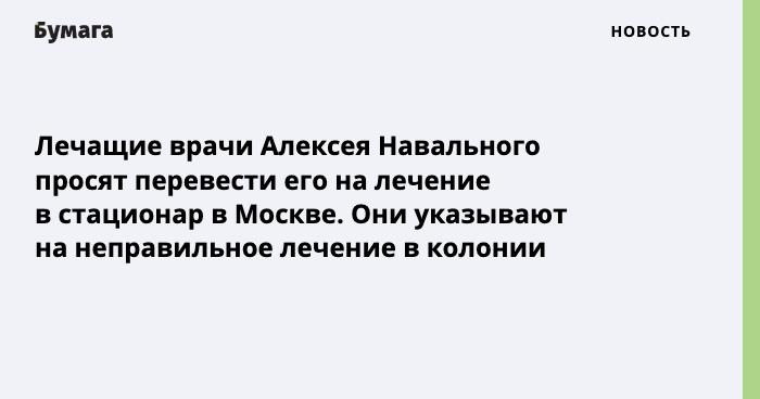 Врачи просят «в самые короткие сроки» перевести Навального в многопрофильный стационар в Москве с учетом вышеуказанного, а также того, что ему может понадобиться оперативное нейрохирургическое вмешательство.