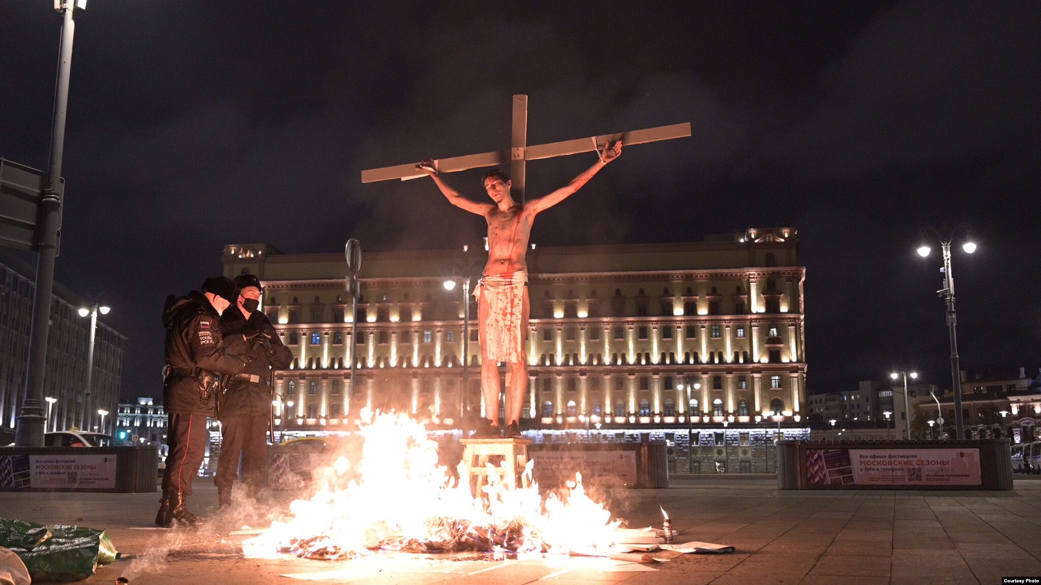 - В начале ноября Крисевич устроил акцию напротив здания ФСБ в Москве. Он встал на табурет, привязал свои руки к кресту и имитировал распятие Иисус Христа. Напротив него другие активисты – в плащах с надписями ФСБ – сложили и подожгли тома уголовных дел с надписями "Дело Бориса Немцова" и "Дело сестер Хачатурян".