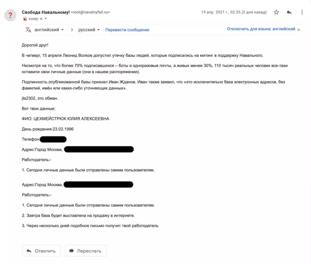 Напомним, что некоторое время назад после утечки базы зарегистрировавшихся на сайте «Свободу Навальному!» пользователям, указавшим свои адреса, начали приходить письма с их личными данными и угрозами. Во всех письмах помимо электронных адресов, которые люди оставляли на сайте, ставя точку на карте, в знак того, что они готовы выйти на митинг, содержались данные, недоступные без сопоставления с материалами государственных баз: а именно адрес проживания, ФИО, телефонный номер, данные работодателя.