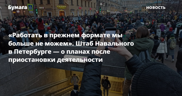 Штаб Навального в Петербурге объявил, что после приостановки деятельности не сможет работать в прежнем формате, так как это «небезопасно для сотрудников и сторонников». Пост опубликован в телеграм-канале штаба.