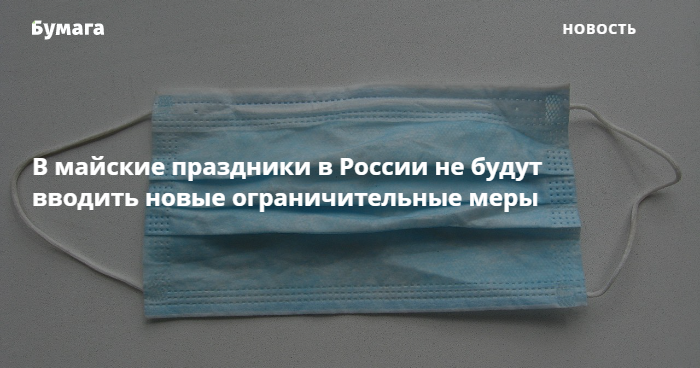 «Чтобы дополнительно организовать работу в преддверии майских праздников и выпустить соответствующие рекомендации для органов власти, для граждан по соблюдению ограничительных мер, мы направили органам государственной власти напоминание о необходимости придерживаться тех рекомендаций, которые уже ранее были сформулированы Роспотребнадзором. Ничего здесь нового не появляется, это наши традиционные рекомендации, которые необходимо соблюдать», — цитирует ТАСС Голикову.