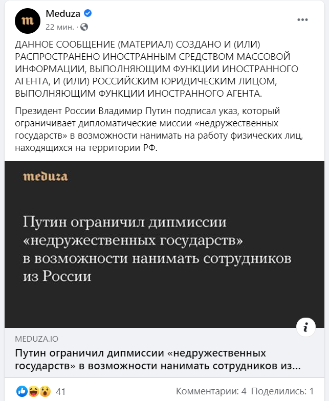 - Theoretically, it’s not just Meduza who is affected: anyone who shares a link to a Meduza story is now supposed to refer to the media outlet’s ‘foreign agent’ status. If not, that individual can also be deemed a ‘media foreign agent’ (although this procedure has not yet been tested in court).