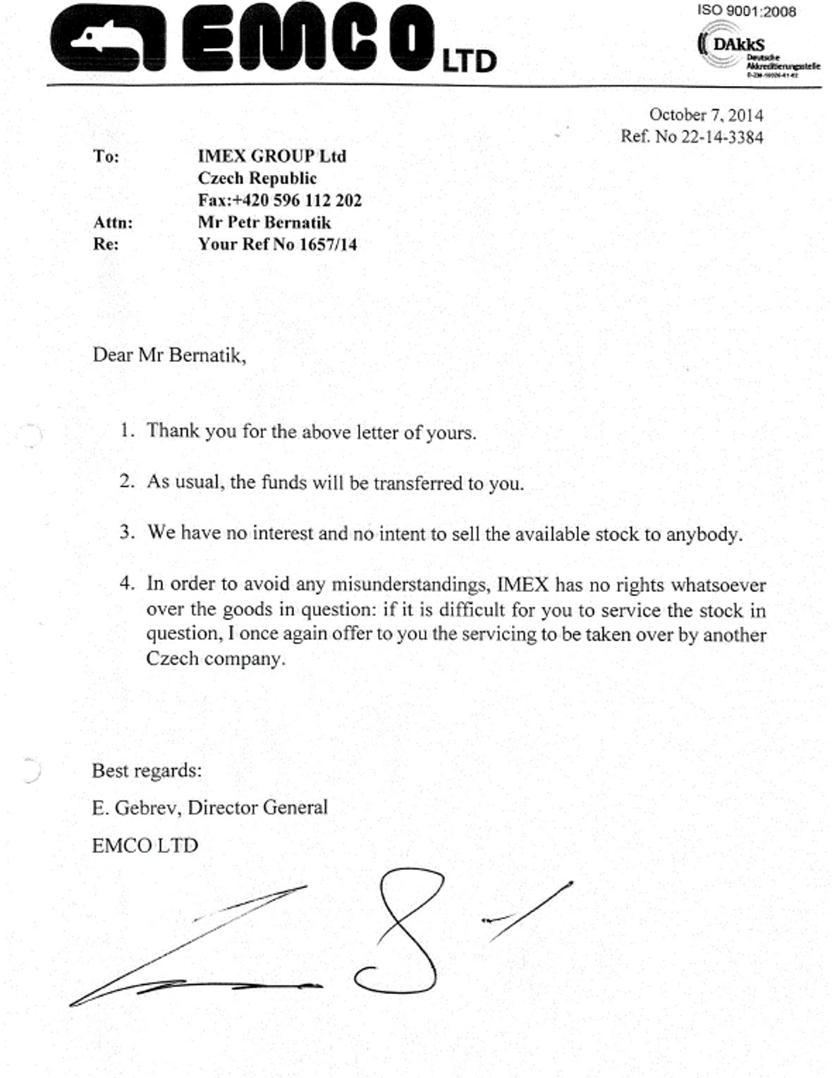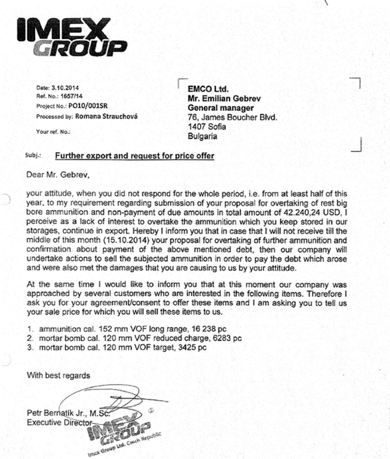 3 октября 2014 года гендиректор Imex Петр Бернатик (управляющий чешским складом) написал Гебреву письмо с жалобой на то, что EMCO еще не забрала боеприпасы, которые компания закупила у чешского торговца оружием. Он потребовал уплаты просроченных платежей за хранение и призвал EMCO вывести запасы до 15 октября 2014 года. Бернатик также сообщил Гебреву, что к Imex обратились «несколько клиентов», заинтересованных в значительной части запасов EMCO, хранящихся в Чехии, — примерно 10 тысяч 120-мм минометных мин и более 16 тысяч 152-мм крупнокалиберных снарядов (это почти все, что было у Гебрева на чешском складе).