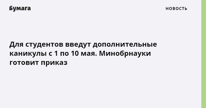 Студенты российских вузов смогут уйти на дополнительные каникулы с 1 по 10 мая. Минобрнауки готовит соответствующий приказ, сообщил ТАСС замглавы министерства Дмитрий Афанасьев.