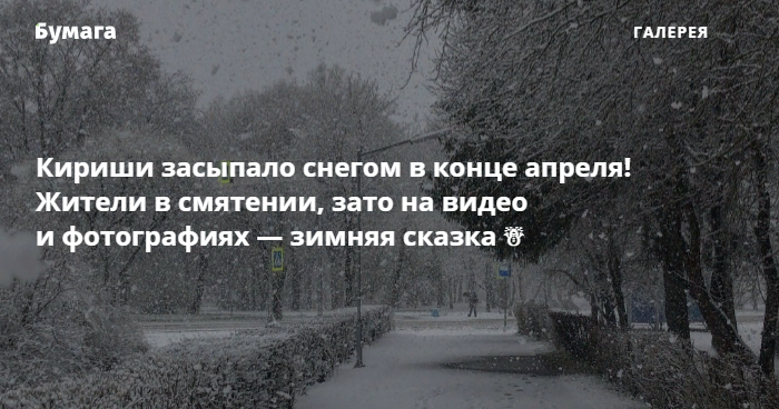 Город Кириши в Ленинградской области 26 и 27 апреля внезапно засыпало снегом. На видео и фотографиях — настоящая зима, а на дороги пришлось вывезти снегоуборочную технику. Не все местные жители рады причудам весны, зато кадры получаются красивые. «Бумага» собрала снимки и ролики неожиданной зимы в Киришах.