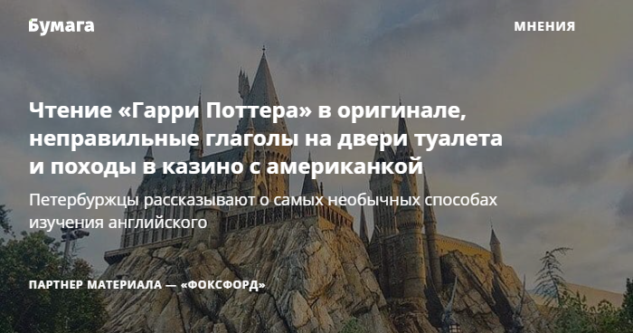— В старших классах школы учительница по английскому дала мне почитать «Гарри Поттера» в оригинале. Эти книжки я очень любила с детства, поэтому перечитывать их на английском было одно удовольствие. Сначала шло не очень легко, но постепенно по контексту я догадывалась о значениях разных слов. Мой словарный запас сильно пополнился: в том числе такими терминами, как «зелье», «заклинание» и «волшебная палочка». В итоге я перечитала все семь книг в оригинале.