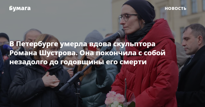 В Петербурге 26 апреля в возрасте 35 лет умерла Мария Касьяненко, вдова умершего от коронавируса скульптора Романа Шустрова. Об этом сообщила ее тетя Евгения Манро.