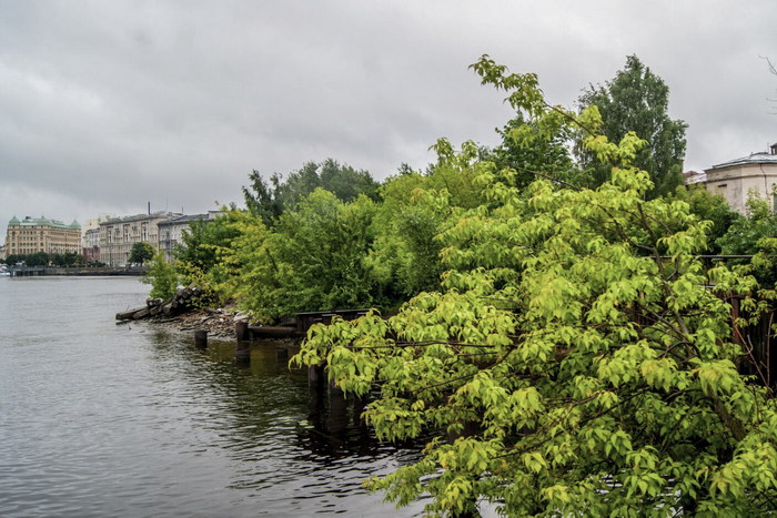 Участок, на котором хотят открыть парк, сейчас не благоустроен. С одной стороны он зарос деревьями и кустами, там есть песчаный берег с обрывами и камнями. Территория ближе к мосту Бетанкура пустует — на ней есть бетонные плиты, остатки пирса и свободные пространства.