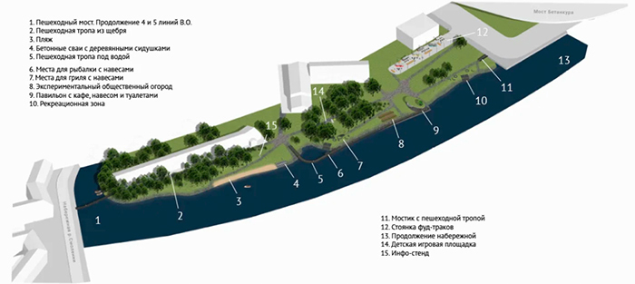 Петербуржцы вместе с фондом «Городские проекты» Ильи Варламова и Максима Каца подготовили план развития участка набережной Макарова на Васильевском острове. Там предлагают открыть парк «Заросли» — с пешеходным мостом, пляжем, местами для рыбалки и гриля, а также фудтраками.