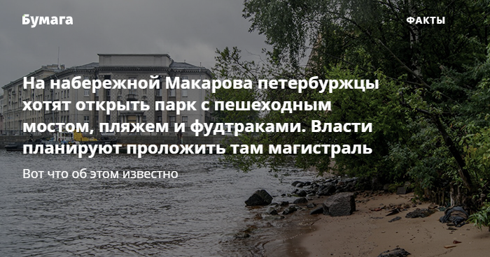 На набережной Макарова петербуржцы хотят открыть парк с пешеходным мостом, пляжем и фудтраками. Власти планируют проложить там магистраль