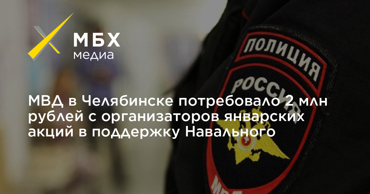 МВД по Челябинской области подало иск к организаторам январских акций в поддержку Алексея Навального, требуя возместить бюджету 2 млн рублей, затраченные на выплаты сотрудникам за дежурство в нерабочее время. Об этом сообщает «Интерфакс».