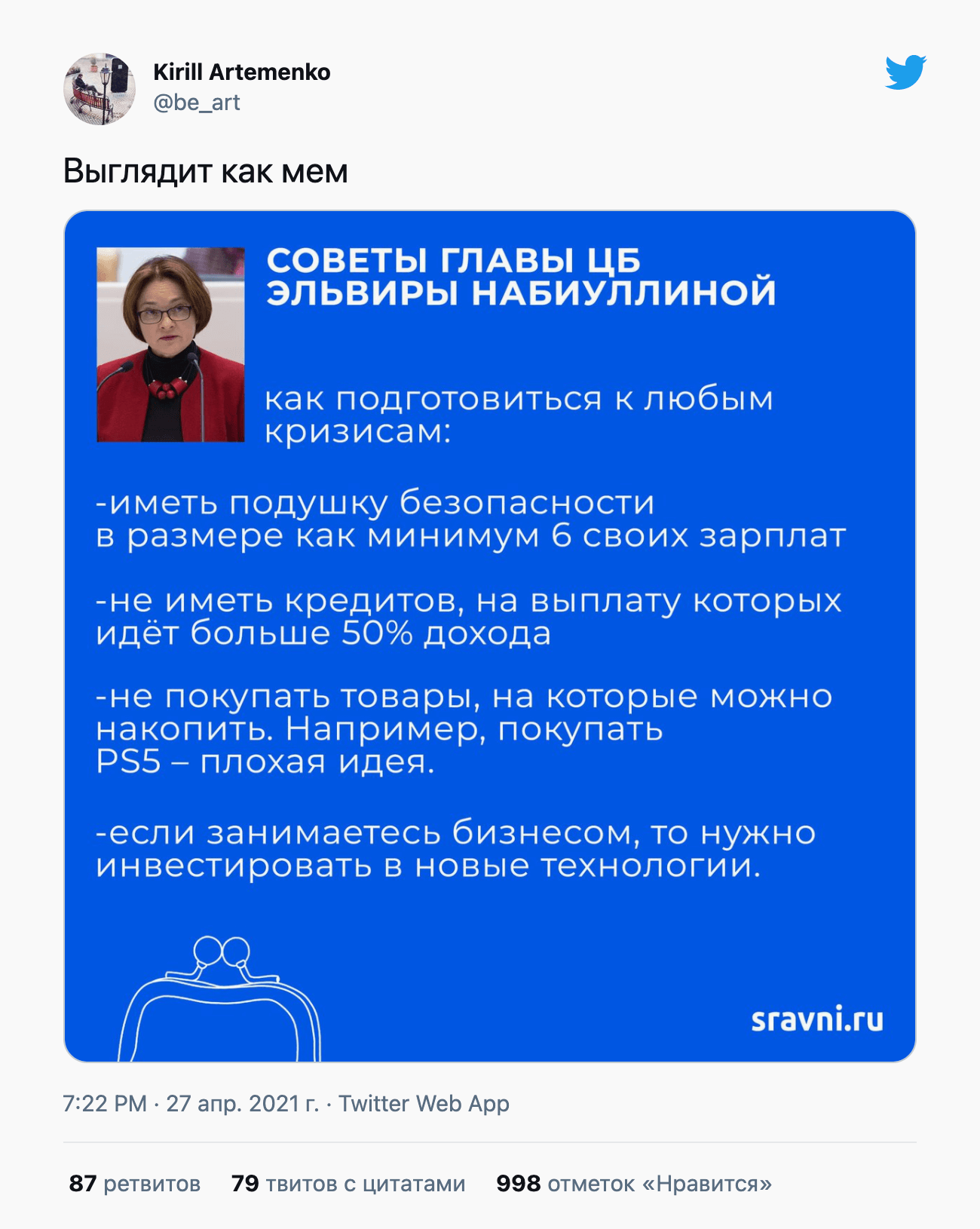 Эльвира Набиуллина отговорила школьников брать кредит на PS5. Зачем — ведь можно просто накопить (видимо, сэкономив на обедах)