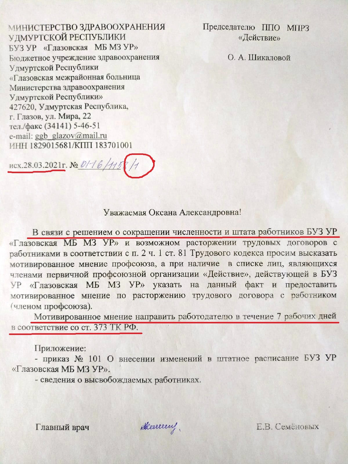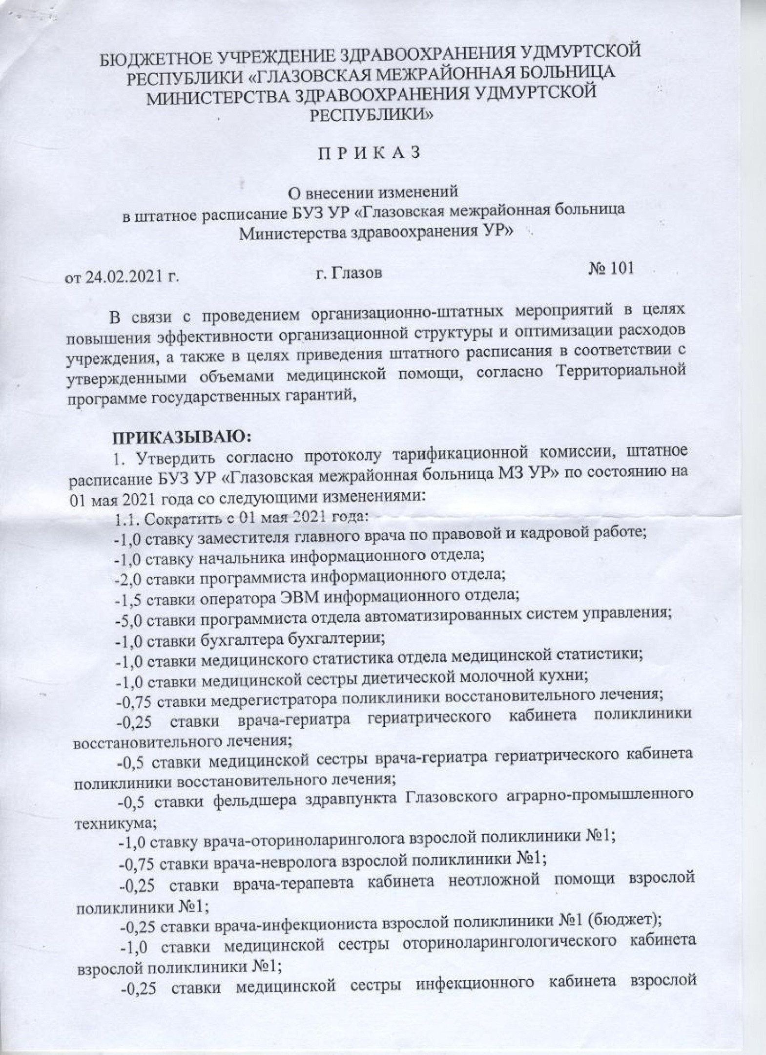 Мы уже писали о том, что Приказом №101 от 24 февраля 2021 года в Глазовской межрайонной больнице с 1 мая запланировано массовое сокращение медицинских ставок при одновременном увеличении обслуживающего персонала, к примеру программистов (более подробно здесь).
