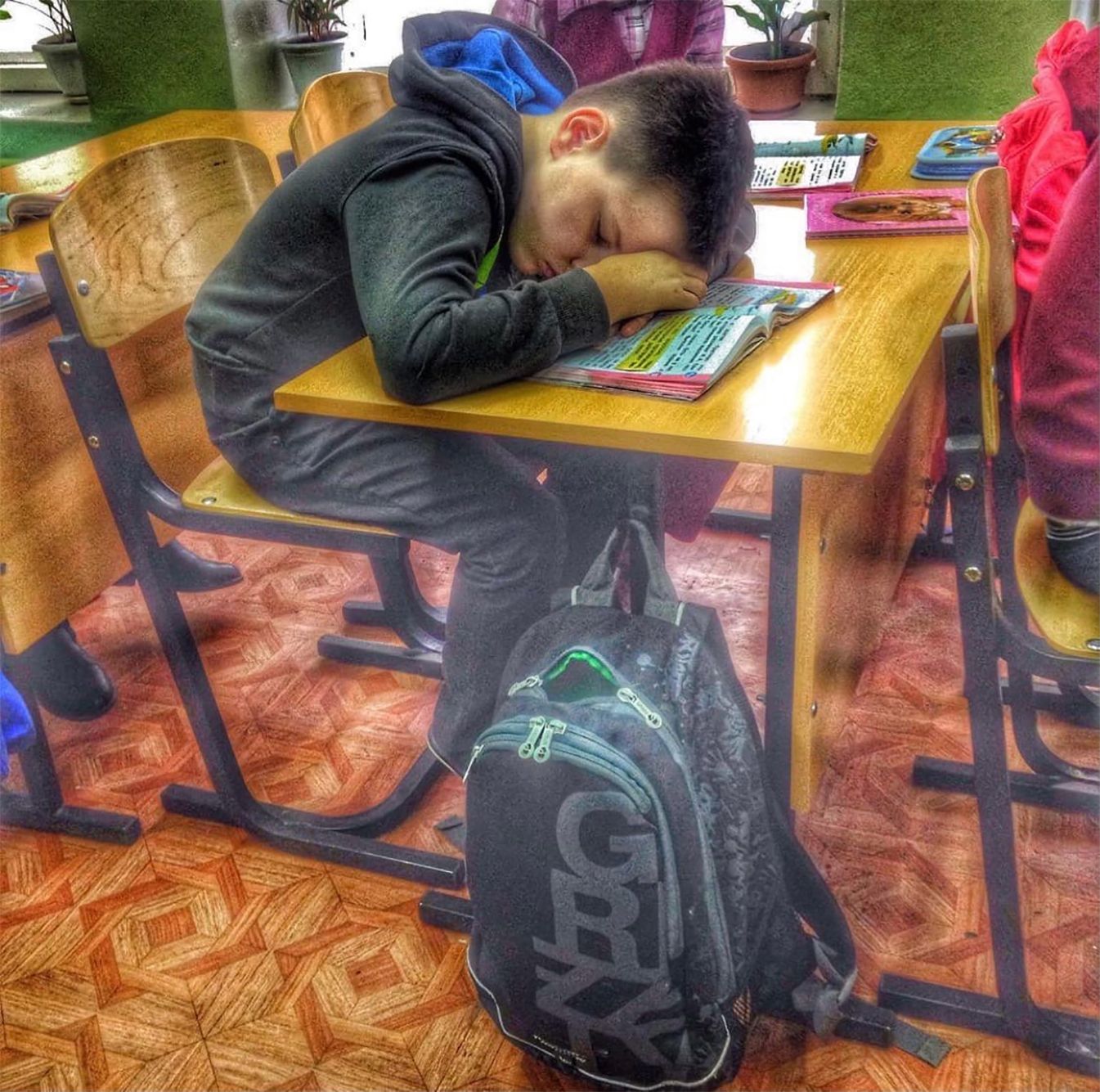 Обычно Егор ложится на парту и спит 15–20 минут урока, после этого его будят учителя. «А один раз, я помню, приехала в школу, чтобы забрать его. Все бегали по коридору, а он спал», — вспоминает Брагина.