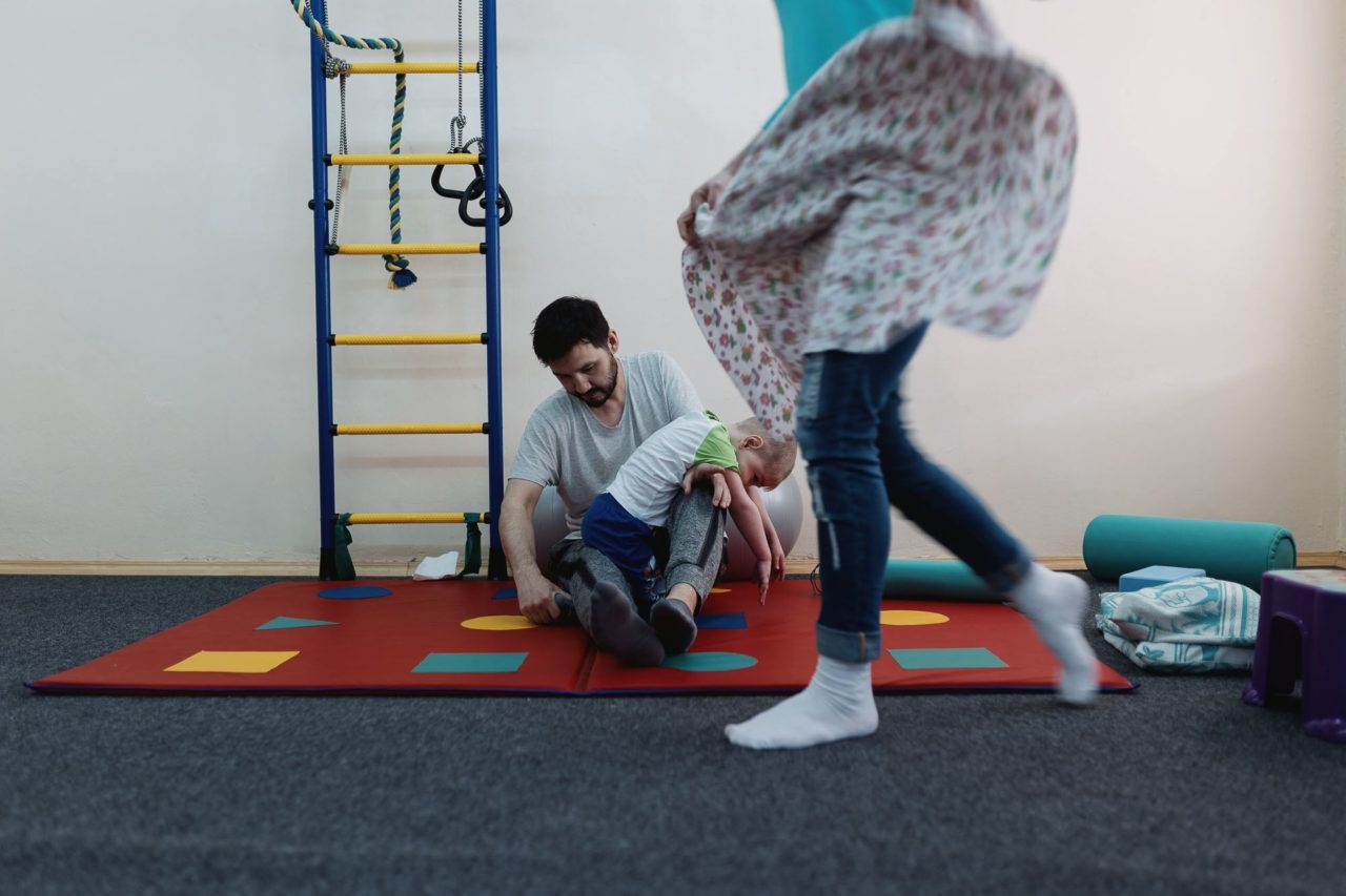 Занятия ЛФК с тренером Азизом. Азиз приезжает в Омск из Крыма, чтобы заниматься с Вадимом и другими детьми. Сегодня у них последнее занятие. Вадим разминается, а потом учится таким простым и одновременно сложным вещам, как, например, держать подолгу головуФото: Вадим Брайдов для ТД В студии их научили общаться с помощью карточек. Таня задает вопрос и поочередно показывает Вадиму карточки с разными картинками, он реагирует. Хмурится и поворачивает голову в сторону — «нет». Улыбается — «да». Улыбаясь, он стал произносить нечто среднее между «на» и «да».
