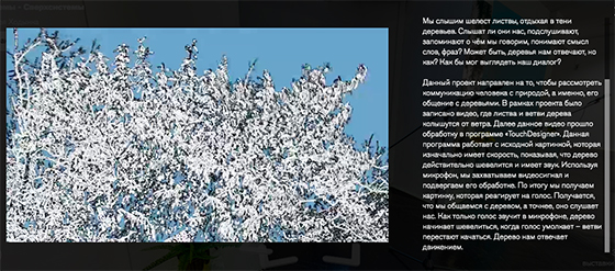 К проекту была обширная экспликация: «Мы слышим шелест листвы, отдыхая в тени деревьев. Слышат ли они нас, подслушивают, запоминают, о чем мы говорим, понимают смысл слов, фраз? Может быть, деревья нам отвечают, но как? Как бы мог выглядеть наш диалог?»