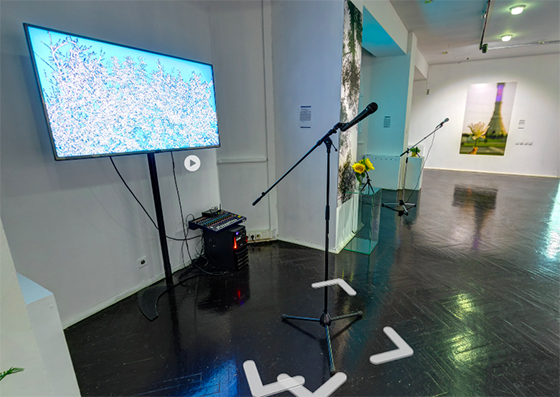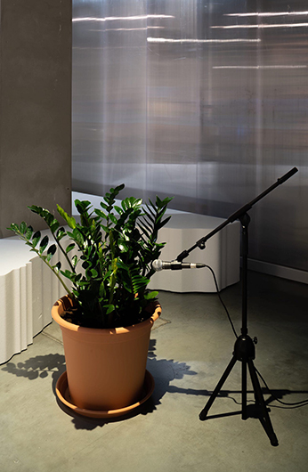 © Иван Ерофеев, Юрий Пальмин / Музей современного искусства «Гараж» Анастасия Кайнеанунг. Растительный Вестник. Экспозиция на Триеннале современного искусства в музее «Гараж». 2020 Итак, зимой 2021 года я случайно зашла на сайт галереи «Ходынка» и на онлайн-выставке «Системы — Сверхсистемы» наткнулась на коллективный проект «Ответ». Он представлял собой микрофон на стойке, направленный к посетителям выставки, и видео на экране с обработанной в компьютерной программе шумящей листвой дерева. К микрофону можно было подойти и что-то сказать, после чего ветки дерева на экране приходили в движение, реагируя на речь. Это и должен был быть, по задумке авторов проекта, «ответ».