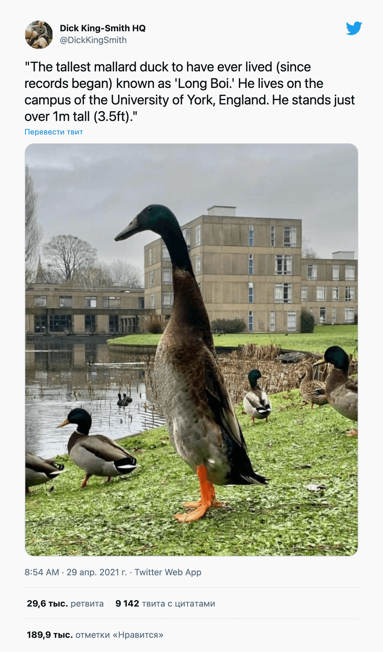 Словом, Длинный парень сразу всех восхитил. Однако нельзя умолчать, что он в каком-то смысле стал героем фейка. Многие авторы постов утверждают, что это самая длинная утка в мире, хотя это не так. Рост самцов индийских бегунов может составлять около 76 сантиметров. Это значит, что Длинный парень на самом деле не самый рослый, а такой… средний! Просто на фоне своих йоркских друзей-уток он выглядит гигантом. Что, безусловно, ни на секунду не умаляет великолепия Длинного парня. Объективно.