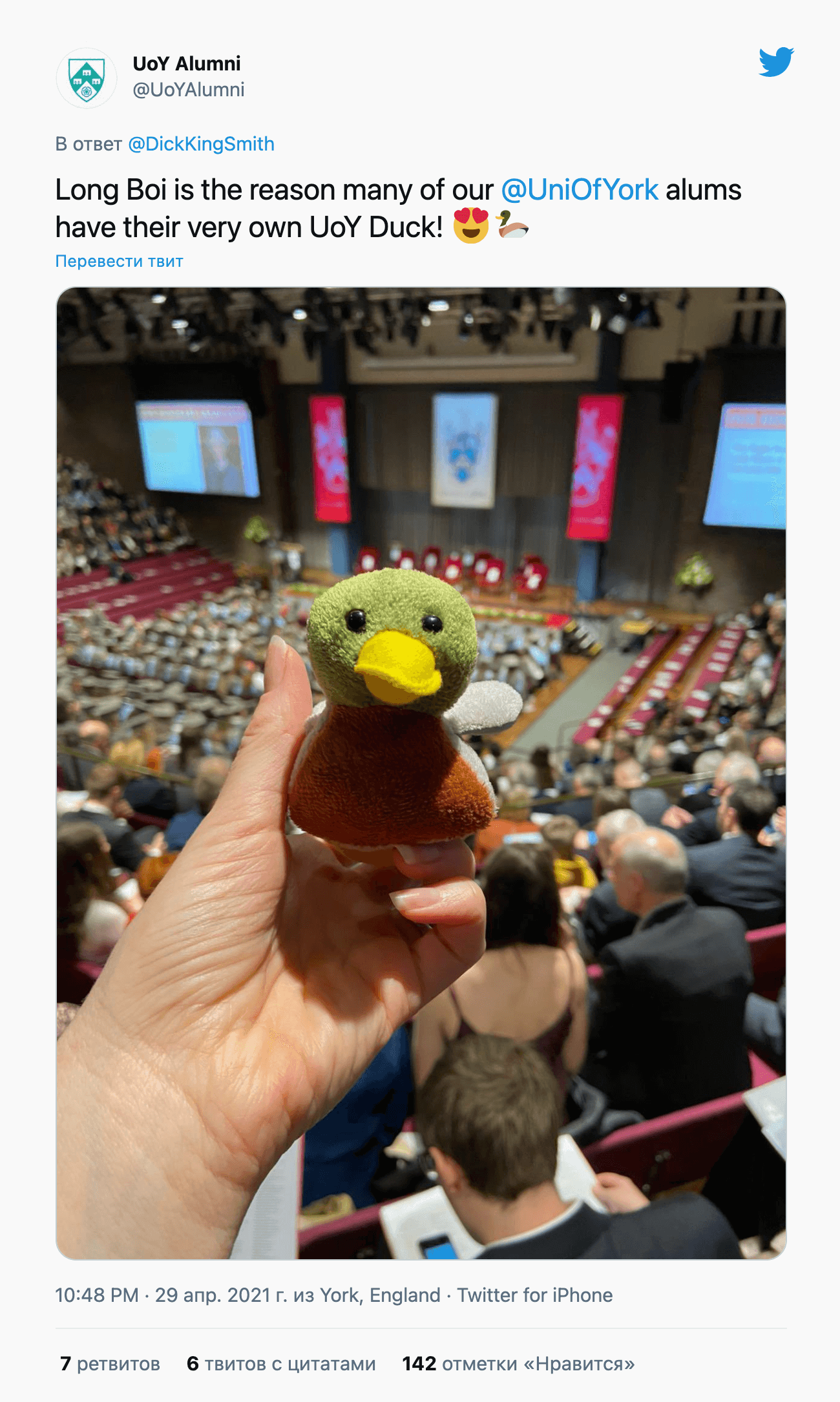 Но вернемся к Длинному парню. Важный нюанс: это не просто утка, а селебрити, которую любят и уважают студенты и сотрудники Университета Йорка в Англии (где живет птица). У учеников даже есть мягкие игрушки с изображением Длинного парня.