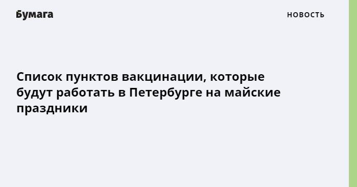 Комитет по здравоохранению Петербурга опубликовал график работы пунктов вакцинации от COVID-19 на майские праздники.